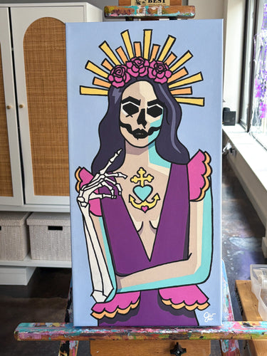 Drawing off her experience as a designer and illustrator, she blended those techniques into acrylic painting in June 2020. Her colorful artwork merges beauty & bones, which result in unique pop art figures that embrace the fragility and vulnerability of life.